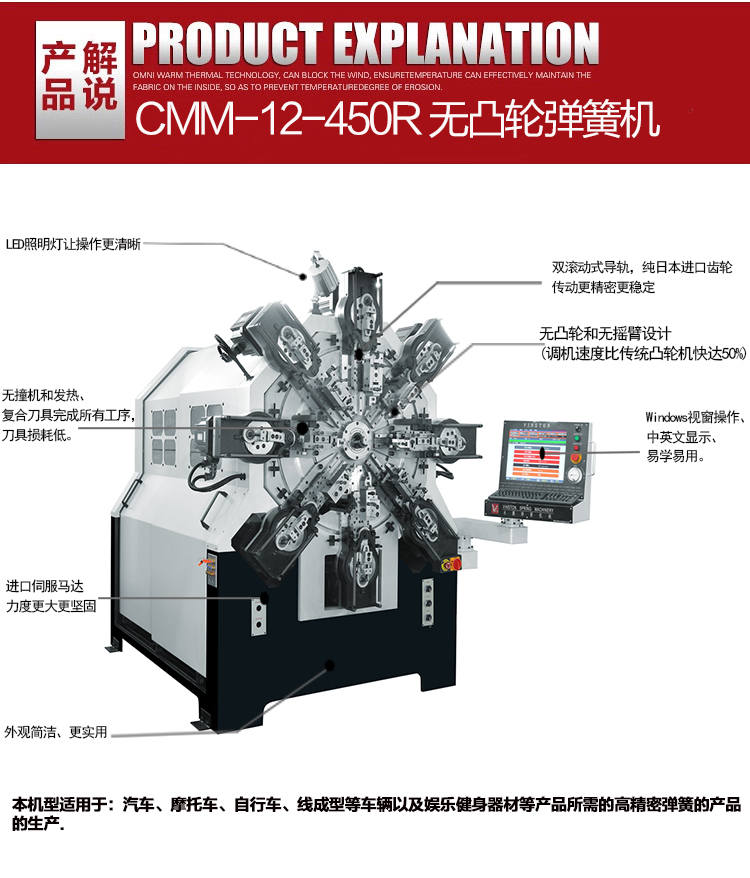 其次,永騰無(wú)凸輪彈簧機(jī)上無(wú)滾動(dòng)式導(dǎo)軌,可長(zhǎng)久保持精度。無(wú)撞機(jī)和發(fā)熱,復(fù)合刀具完成所有工序,工具損耗低。適用于汽車(chē)、摩托車(chē)、自行車(chē)、線(xiàn)成型等車(chē)輛以及娛樂(lè)健身器材等產(chǎn)品所需的高精密彈簧的產(chǎn)品的生產(chǎn).